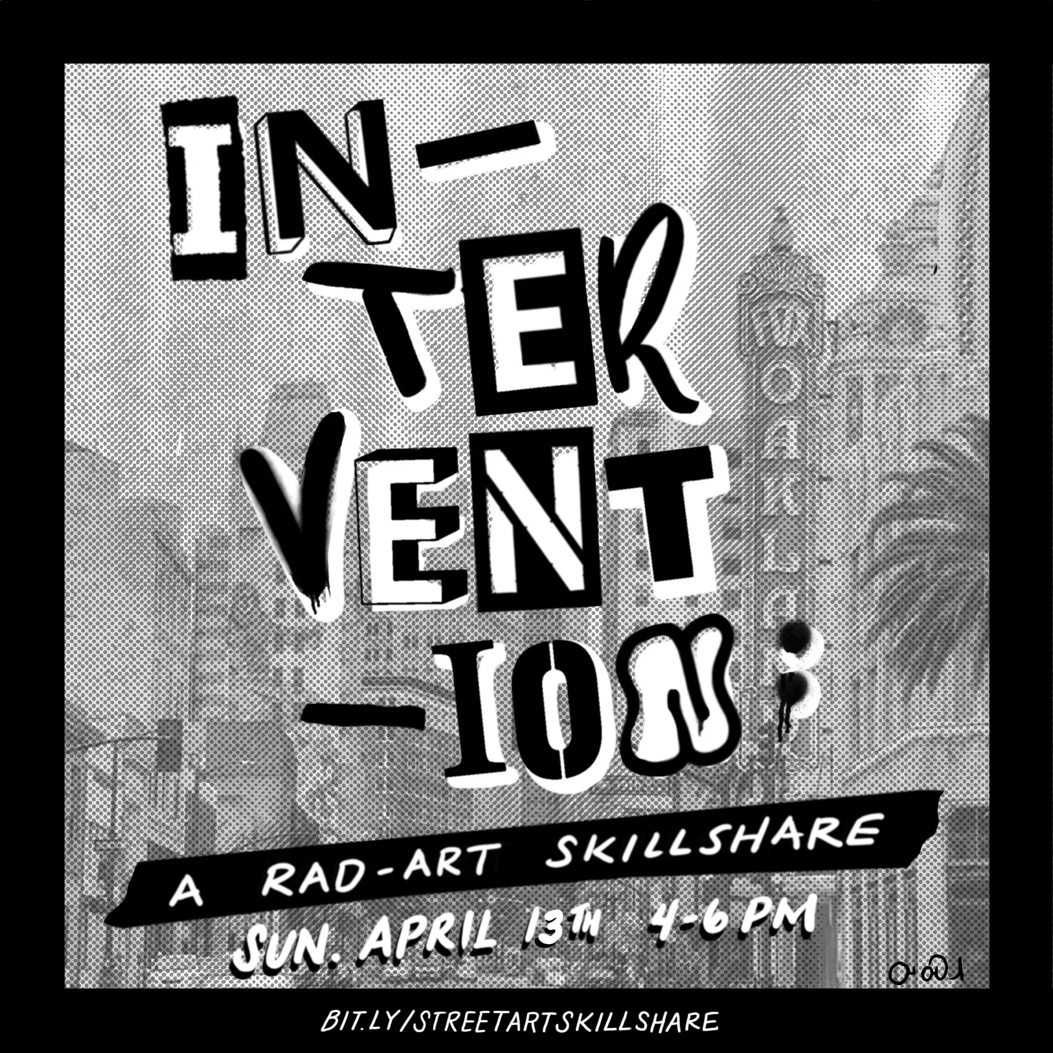 [ID: A black and White photocopy style halftone image of downtown Oakland with the above text in varying fonts]
