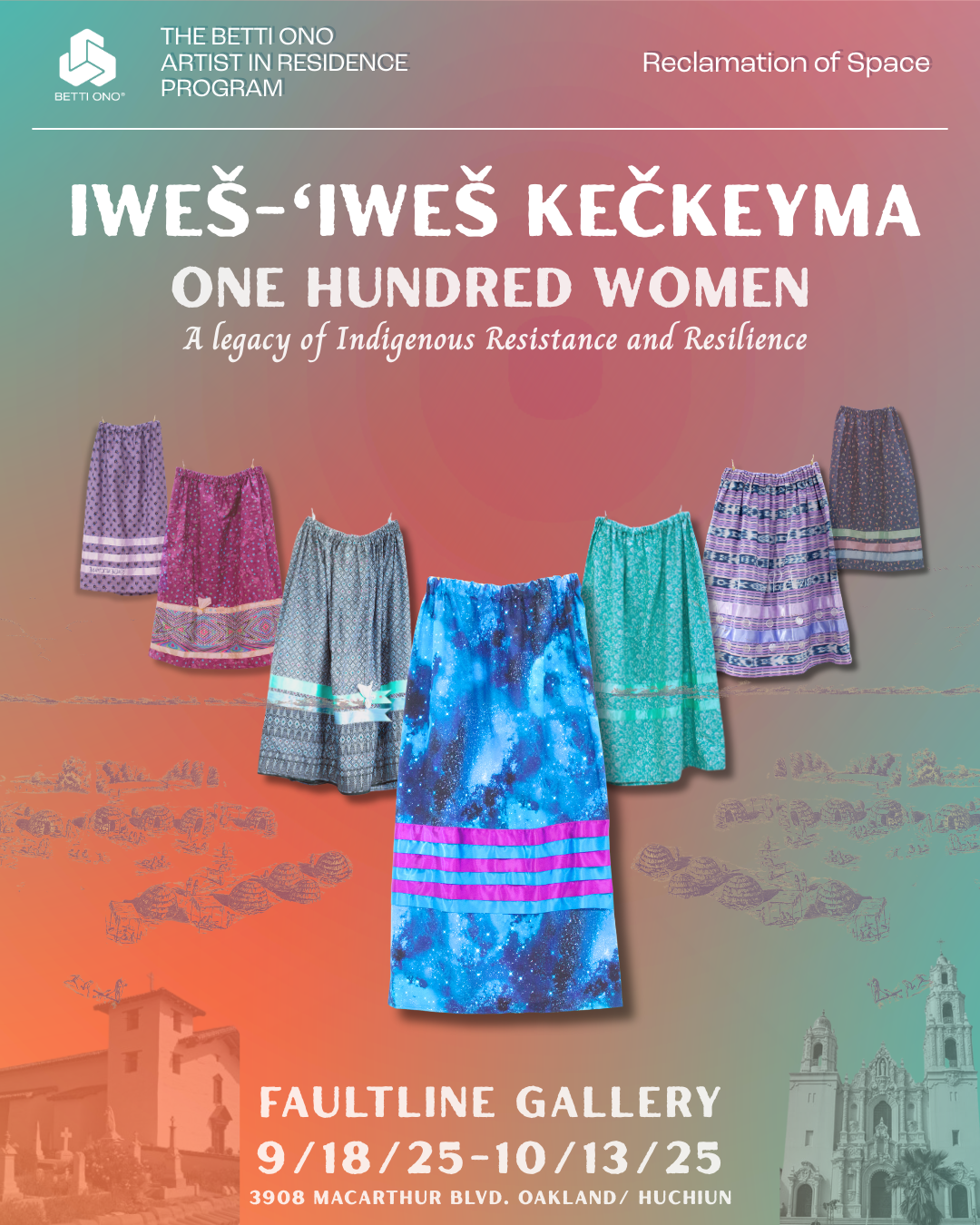 Iweš-‘iweš kečkeyma: One Hundred Women shares the a story of the land we are on through an offering of 100 hand made ribbon skirts created in honor of the first 100 Indigenous women and girls that were taken into the Bay Area Missions in the first wave of colonization.